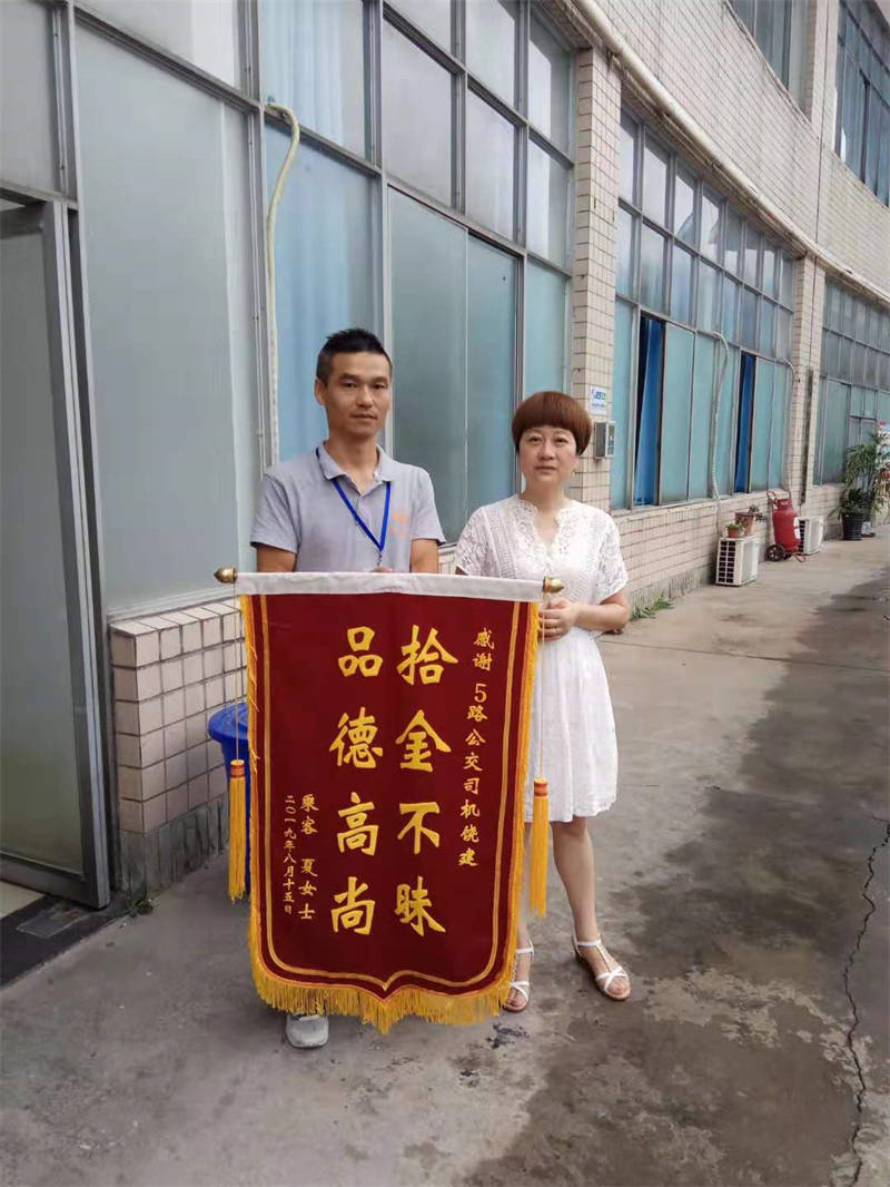 8月20日上午,市民夏女士冒著小雨來到公交總站,親手將一面寫有“拾金不昧品德高尚”的錦旗送到5路公交車司機饒建手上。送上錦旗時,夏女士口中還在不停的念叨著:“公交司機師傅很棒,真的要感謝你喲!