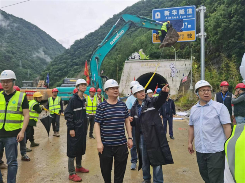 曹剛一行抵達(dá)寶興河電站,徒步前往新華村寶興河壅塞體查看災(zāi)情,附后前往新華村隧道口,看望慰問(wèn)在搶通一線的交建集團(tuán)施工人員,詳細(xì)了解搶通進(jìn)度和安全保障措施等情況。