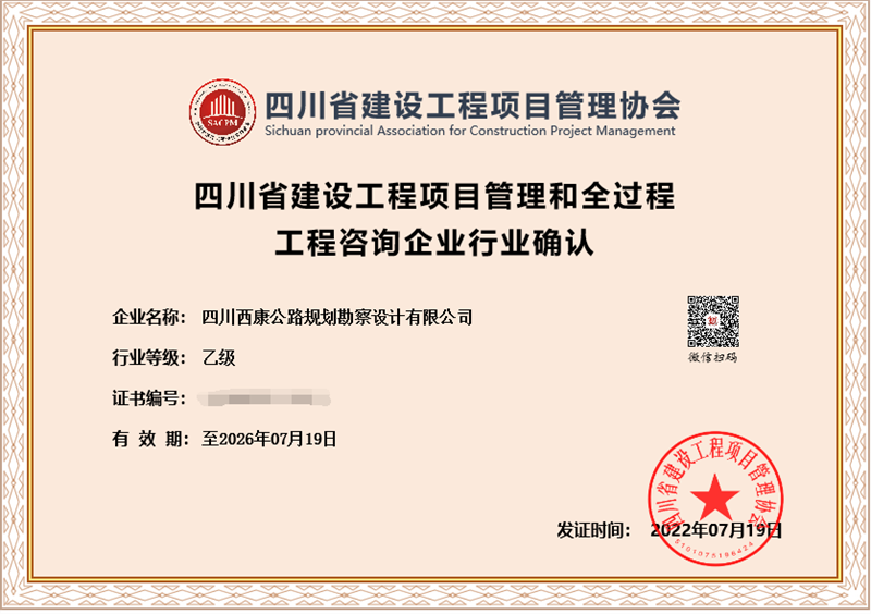 交建勘察設(shè)計(jì)公司取得四川省建設(shè)工程項(xiàng)目管理和全過程工程咨詢企業(yè)行業(yè)乙級(jí)資質(zhì)