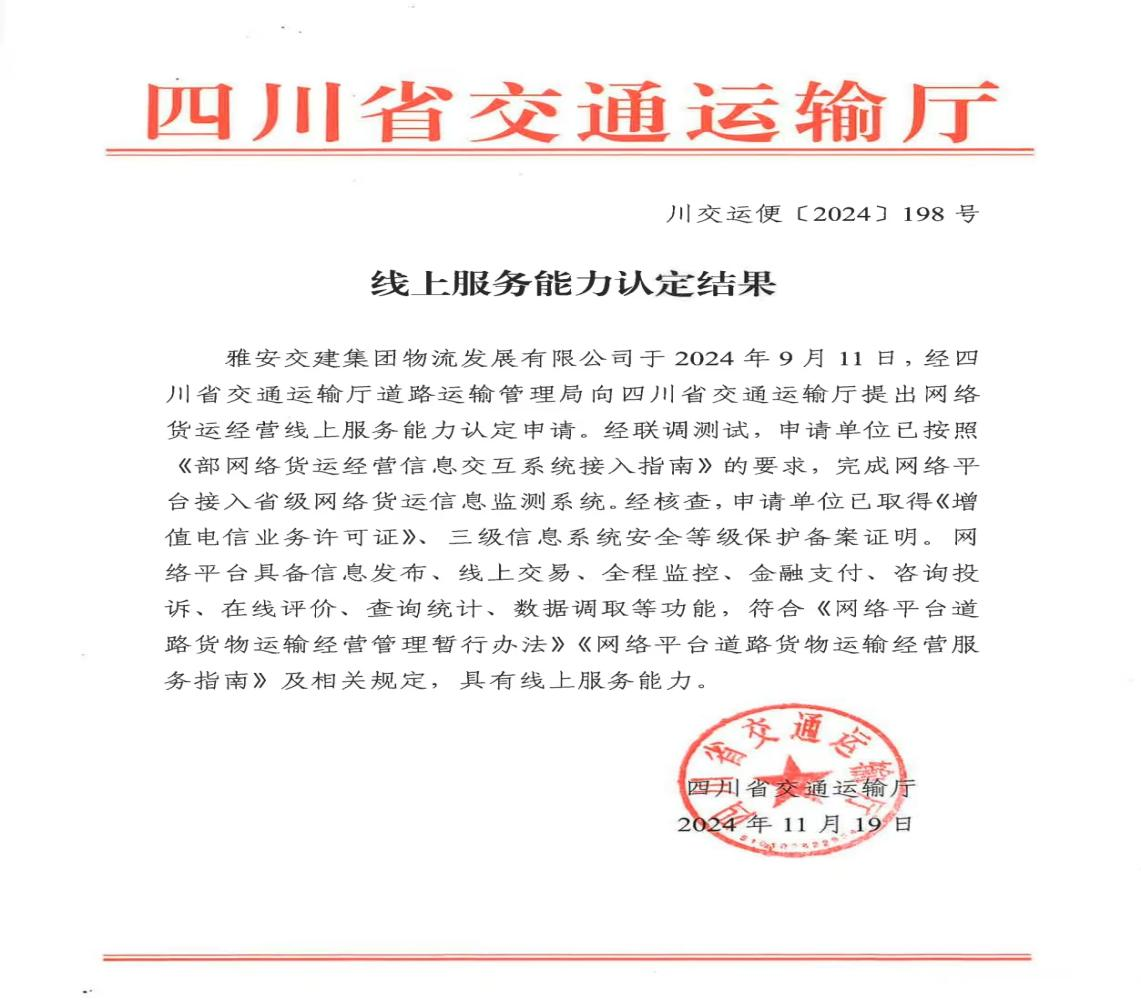 近日,《四川省交通運輸廳線上服務(wù)能力認定結(jié)果》發(fā)布,雅安交建集團物流發(fā)展有限公司正式取得網(wǎng)絡(luò)貨運經(jīng)營線上服務(wù)能力認定,標志著雅安首家國企網(wǎng)絡(luò)貨運平臺即將面向市場運營。