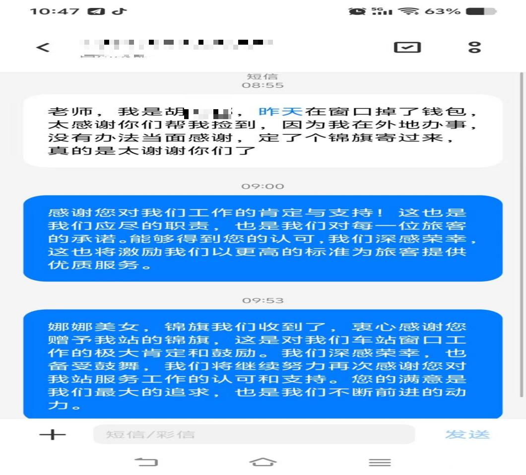 5月14日11時(shí)11分,售票員郝凌云發(fā)現(xiàn)柜臺(tái)上遺留了一個(gè)卡包,內(nèi)有現(xiàn)金 300 元、多張銀行卡、身份證及社?ǖ戎匾锲。郝凌云第一時(shí)間上報(bào)值班科長(zhǎng),通過(guò)站務(wù)系統(tǒng)比對(duì)購(gòu)票信息,僅用5分鐘便鎖定失主為即將前往漢源的旅客胡女士,此時(shí)胡女士正在等待檢票,尚未察覺(jué)錢(qián)包丟失。值班站長(zhǎng)通過(guò)廣播系統(tǒng)緊急尋人,胡女士聽(tīng)到廣播后立即前往值班室認(rèn)領(lǐng)物品,經(jīng)值班科長(zhǎng)仔細(xì)核對(duì)身份及物品信息后,將卡包完好歸還。胡女士激動(dòng)致謝:“太感謝你了!你們汽車(chē)站的工作人員素質(zhì)真高,太讓人暖心了!”