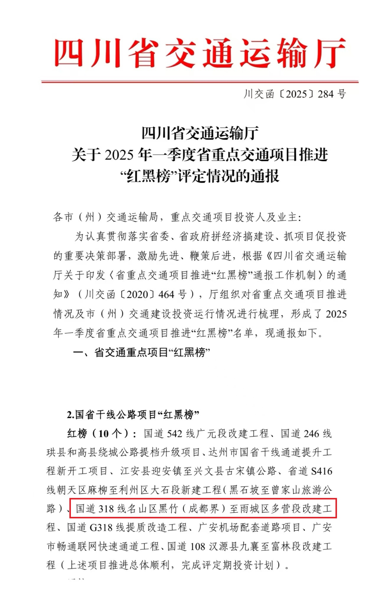 近日,四川省交通運(yùn)輸廳發(fā)布2025年一季度省重點(diǎn)交通項(xiàng)目推進(jìn)“紅黑榜”評(píng)選結(jié)果,由雅安交建集團(tuán)四川康藏路橋有限責(zé)任公司承建的國道318線名山區(qū)黑竹(成都界)至雨城區(qū)多營(yíng)段改建工程憑借超額完成投資計(jì)劃、關(guān)鍵節(jié)點(diǎn)取得突破等成效,成功入選國省干線公路項(xiàng)目“紅榜”。
