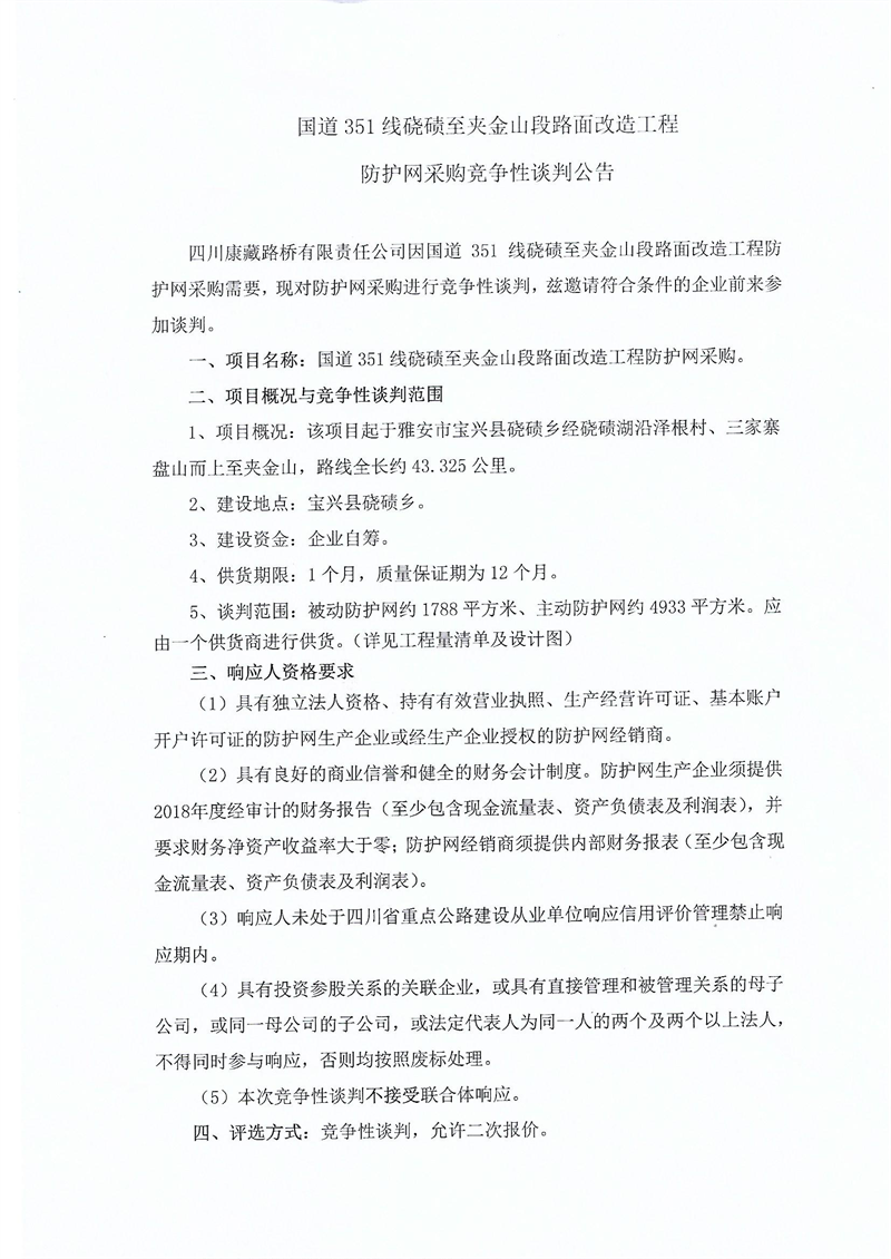 四川康藏路橋有限責任公司國道351線磽磧至夾金山段路面改造工程防護網(wǎng)采購競爭性談判公告