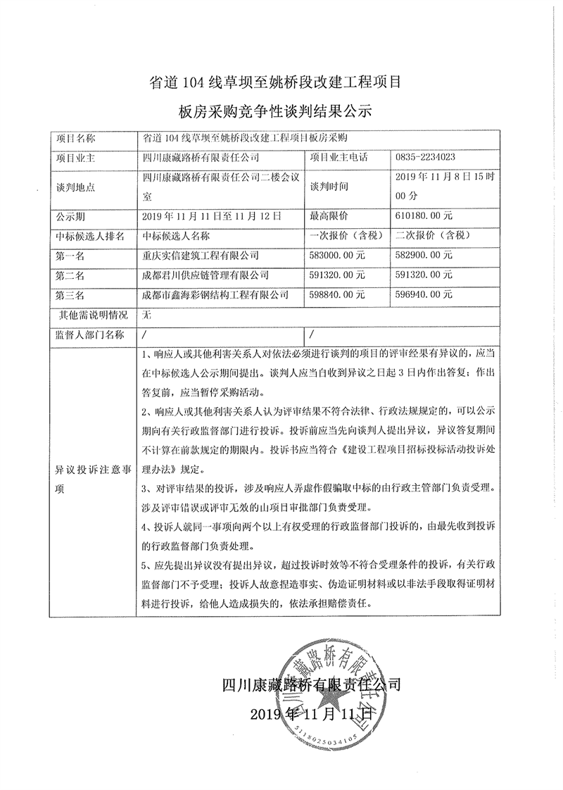 四川康藏路橋有限責(zé)任公司省道104線草壩至姚橋段改建工程項目板房采購競爭性談判結(jié)果公示