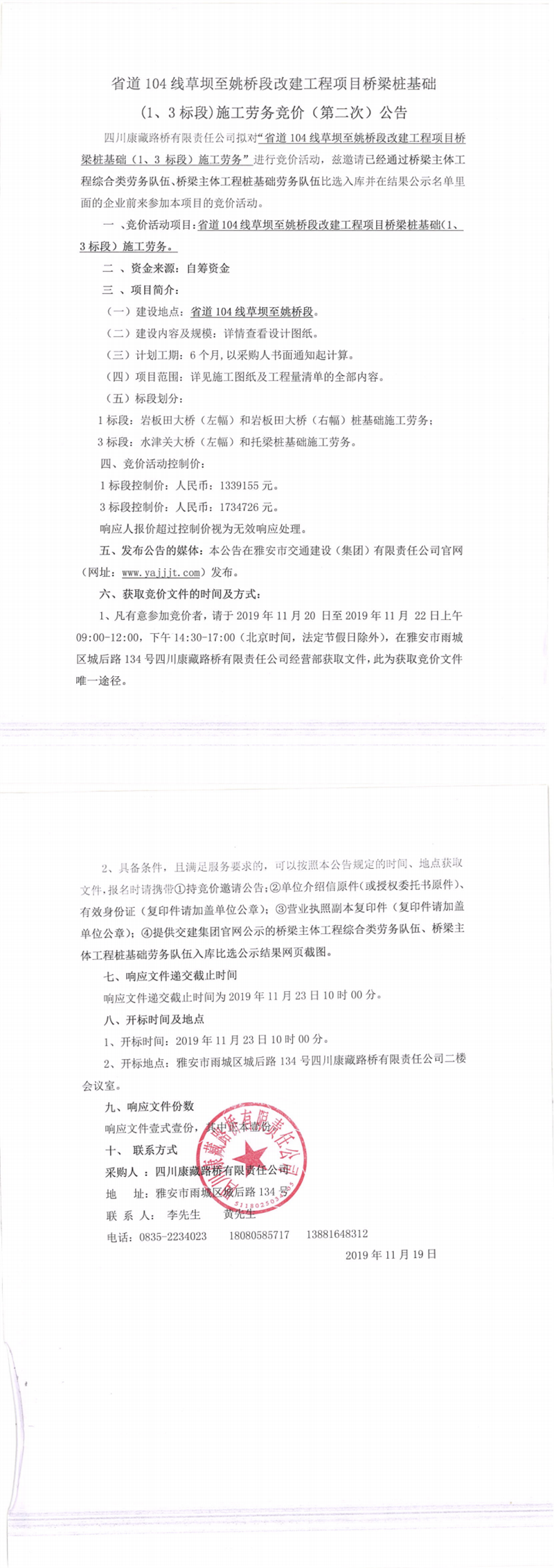 四川康藏路橋有限責(zé)任公司省道104線草壩至姚橋段改建工程項目橋梁樁基礎(chǔ)(1、3標(biāo)段)施工勞務(wù)競價(第二次)公告
