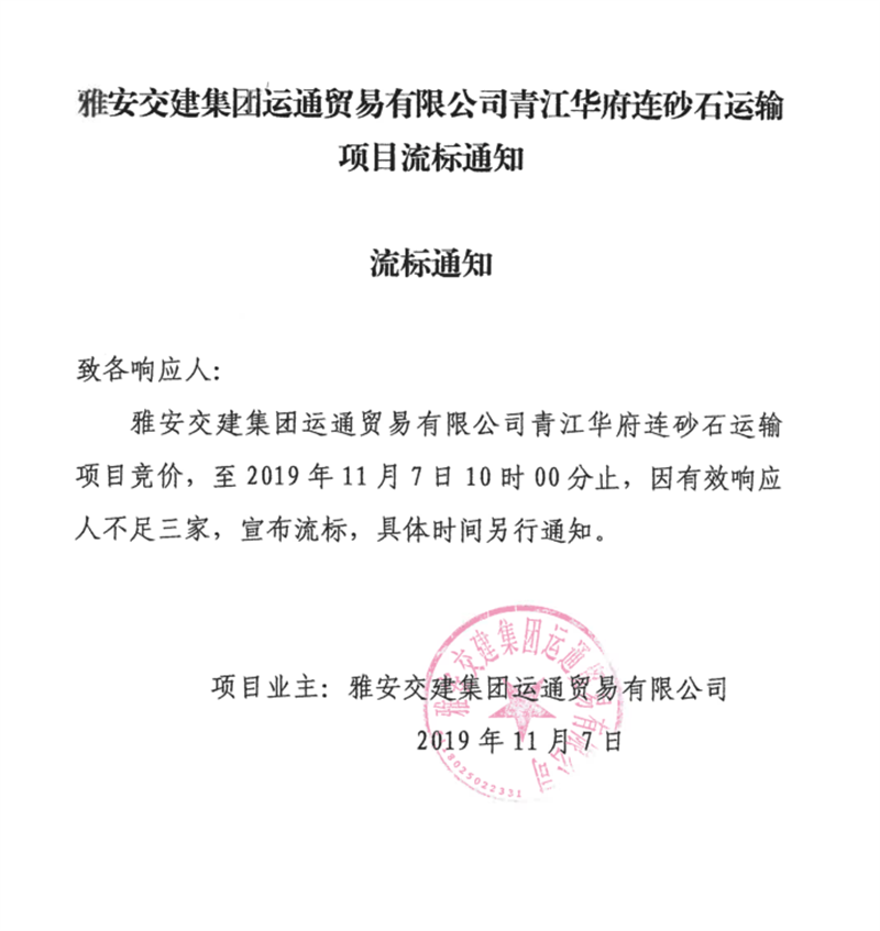雅安交建集團(tuán)運(yùn)通貿(mào)易有限公司青江華府砂石運(yùn)輸項(xiàng)目流標(biāo)通知