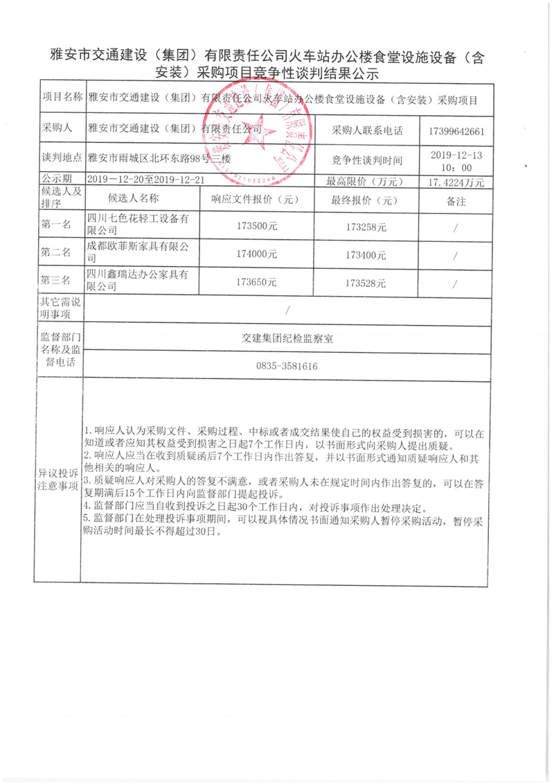 雅安市交通建設(shè)(集團(tuán))有限責(zé)任公司火車站辦公樓食堂設(shè)施設(shè)備(含安裝)采購項目競爭性談判結(jié)果公示