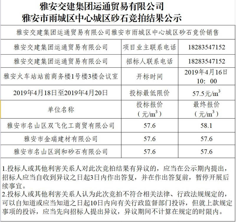 雅安交建集團(tuán)運(yùn)通貿(mào)易有限公司中心城區(qū)砂石競拍結(jié)果公示