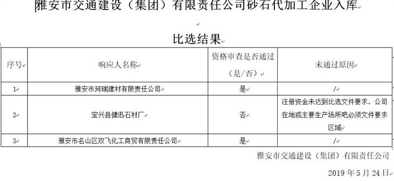 雅安市交通建設(shè)(集團(tuán))有限責(zé)任公司砂石代加工企業(yè)入庫(kù)比選結(jié)果公示