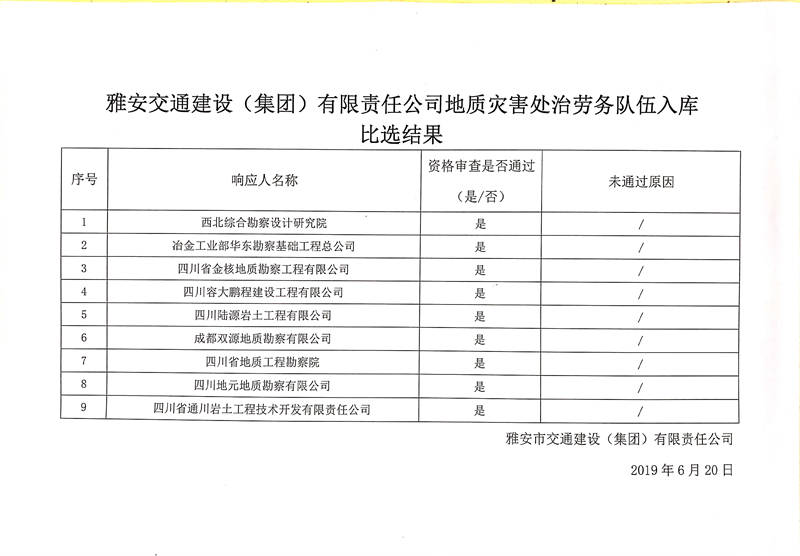 雅安交通建設(集團)有限責任公司地質災害處治勞務隊伍入庫比選結果
