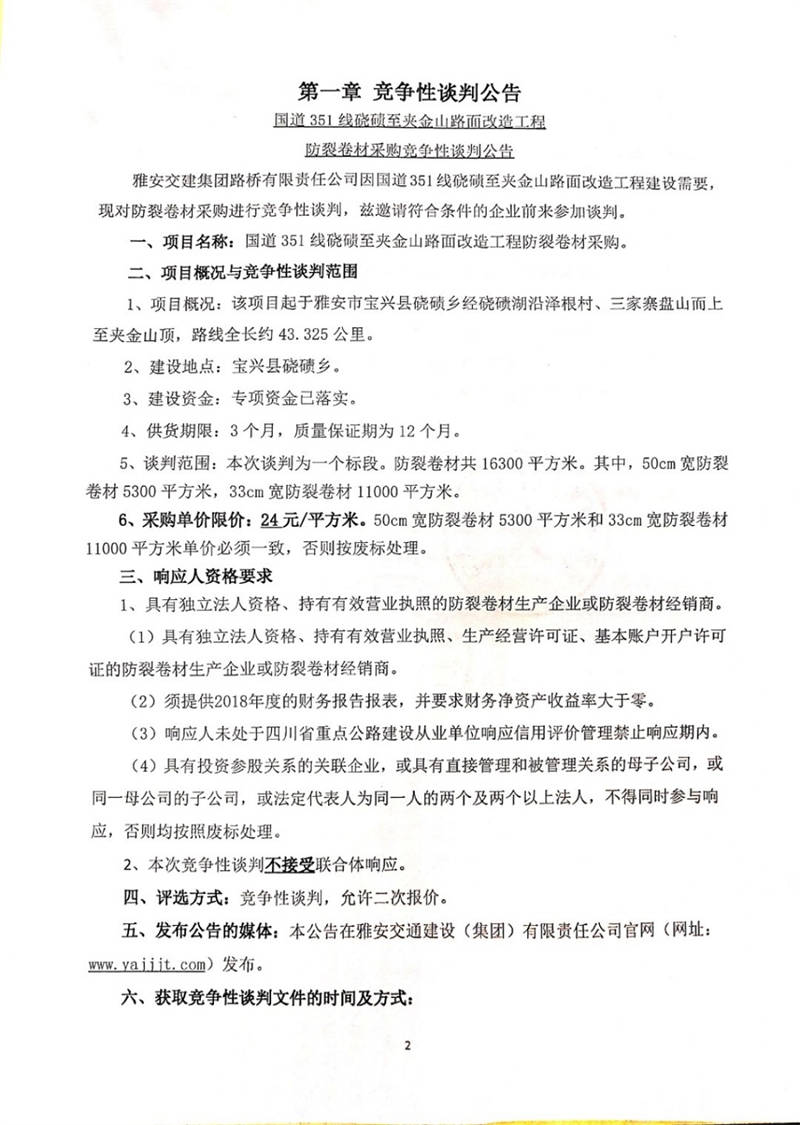 雅安交建集團路橋有限責(zé)任公司國道351線磽磧至夾金山路面改造工程防裂卷材采購競爭性談判公告