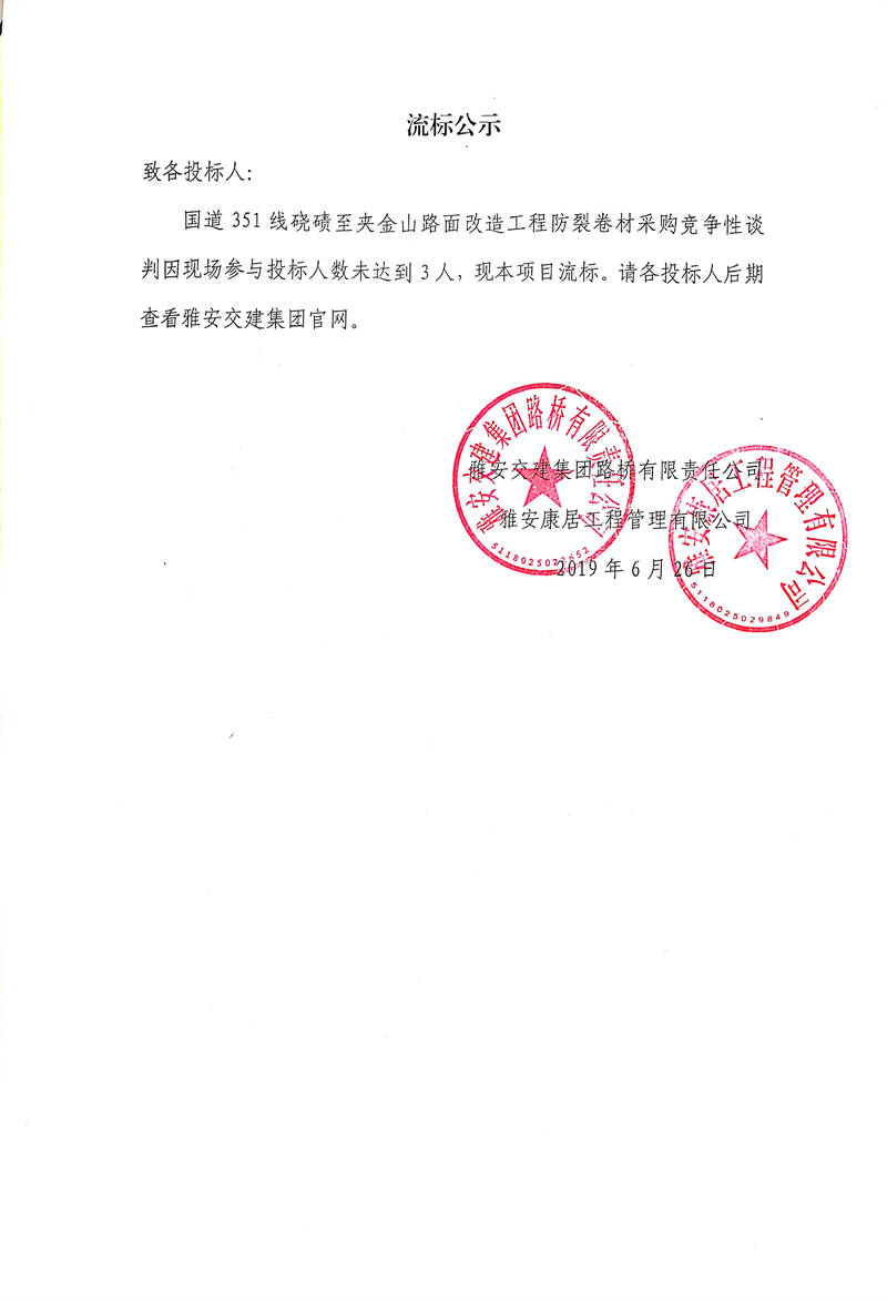 雅安交建集團(tuán)路橋有限責(zé)任公司國(guó)道351線磽磧至夾金山路面改造工程防裂卷材采購(gòu)競(jìng)爭(zhēng)性談判流標(biāo)公示