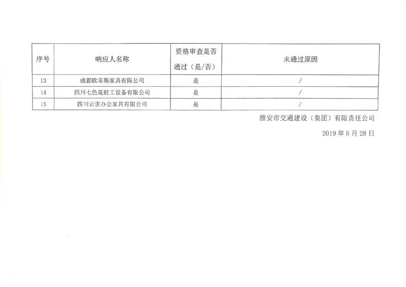 雅安市交通建設(shè)(集團)有限責(zé)任公司辦公家具供應(yīng)商入庫比選結(jié)果