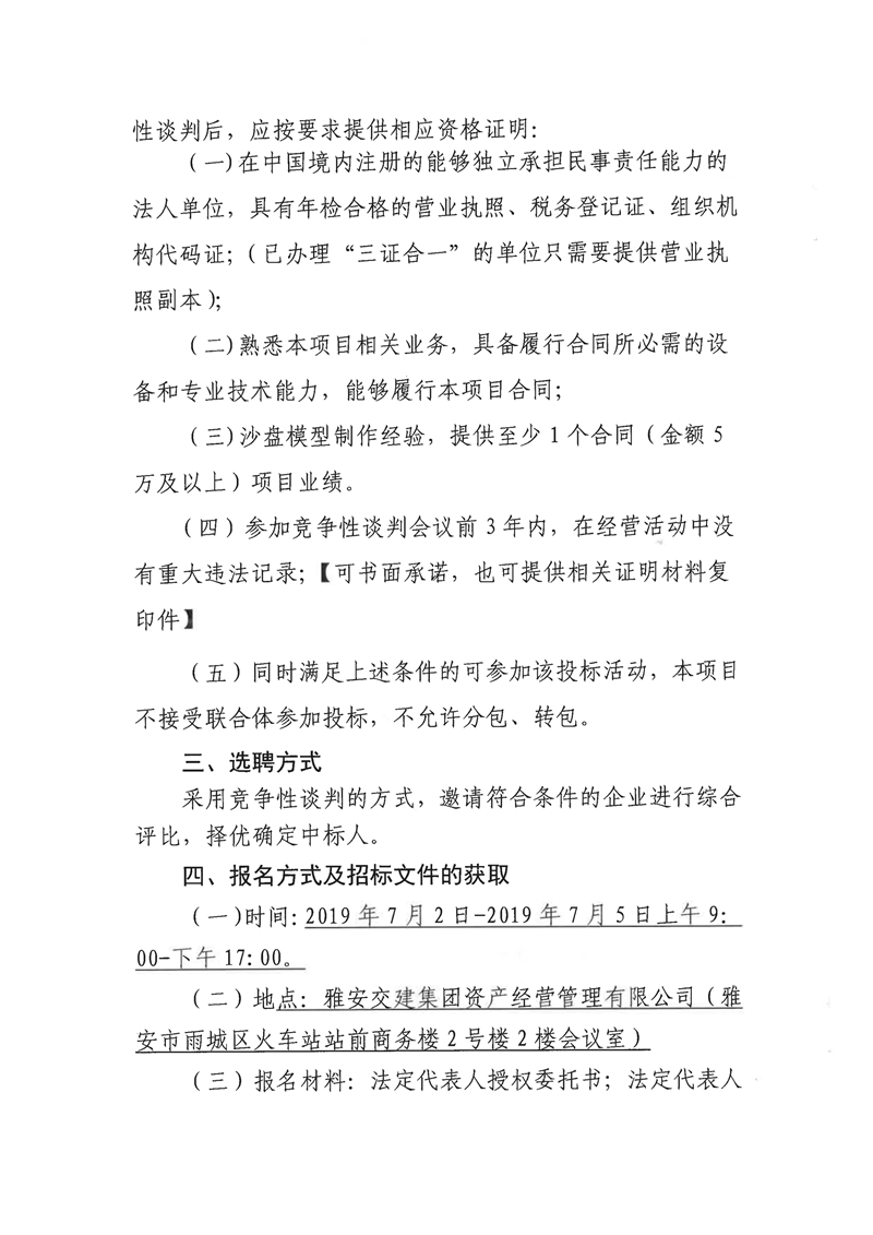 雅安交建集團(tuán)資產(chǎn)經(jīng)營(yíng)管理有限公司成雅高速金雞關(guān)互通及服務(wù)區(qū)項(xiàng)目(雨名快速通道)沙盤模型制作安裝項(xiàng)目競(jìng)爭(zhēng)性談判公告