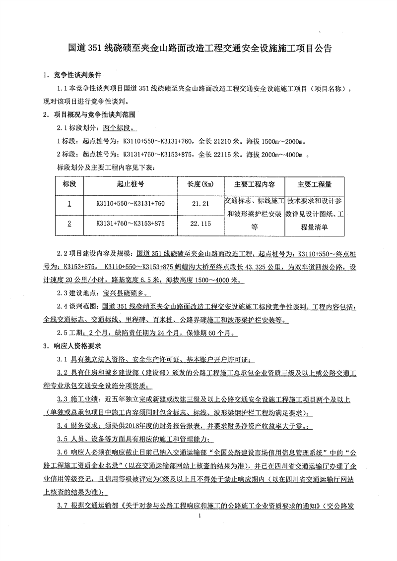 雅安交建集團(tuán)路橋有限責(zé)任公司國(guó)道351線磽磧至夾金山段路面改造工程交通安全設(shè)施施工項(xiàng)目競(jìng)爭(zhēng)性談判公告