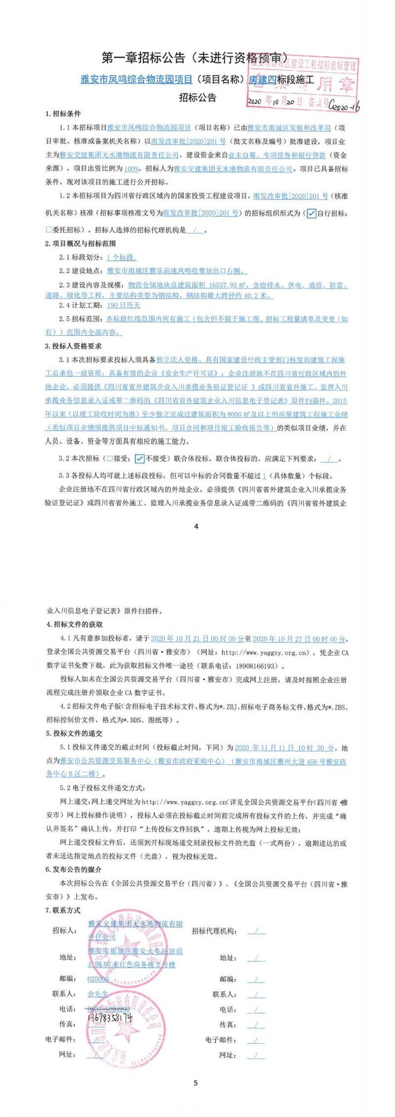 雅安交建集團無水港物流有限責任公司雅安市鳳鳴綜合物流園項目(項目名稱)房建四標段施工招標公告