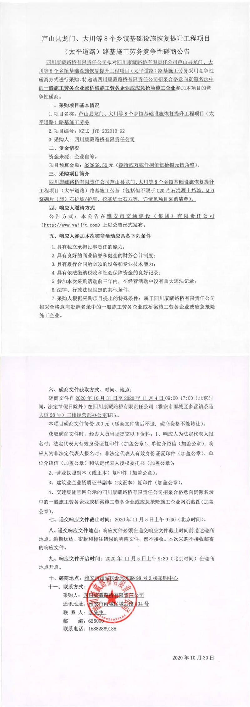 四川康藏路橋有限責(zé)任公司蘆山縣龍門(mén)、大川等8個(gè)鄉(xiāng)鎮(zhèn)基礎(chǔ)設(shè)施恢復(fù)提升工程項(xiàng)目(太平道路)路基施工勞務(wù)競(jìng)爭(zhēng)性磋商公告