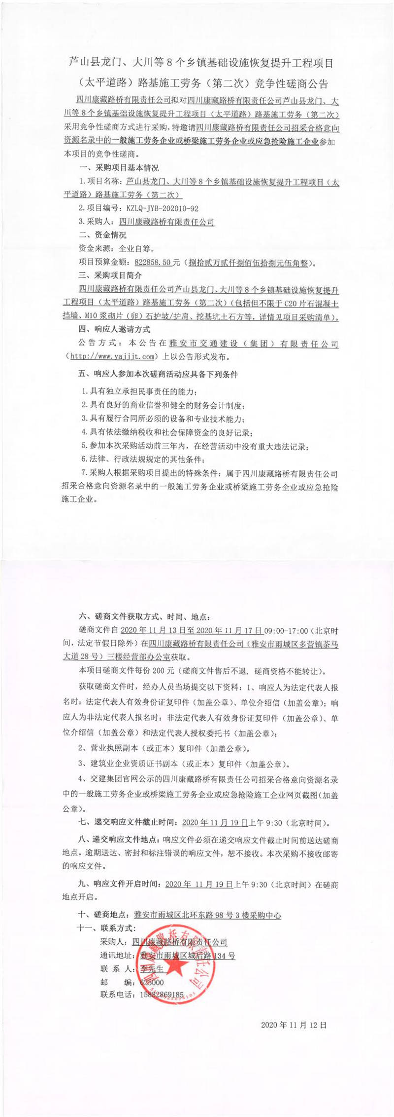 四川康藏路橋有限責(zé)任公司蘆山縣龍門、大川等8個鄉(xiāng)鎮(zhèn)基礎(chǔ)設(shè)施恢復(fù)提升工程項(xiàng)目(太平道路)路基施工勞務(wù)(第二次)競爭性磋商公告
