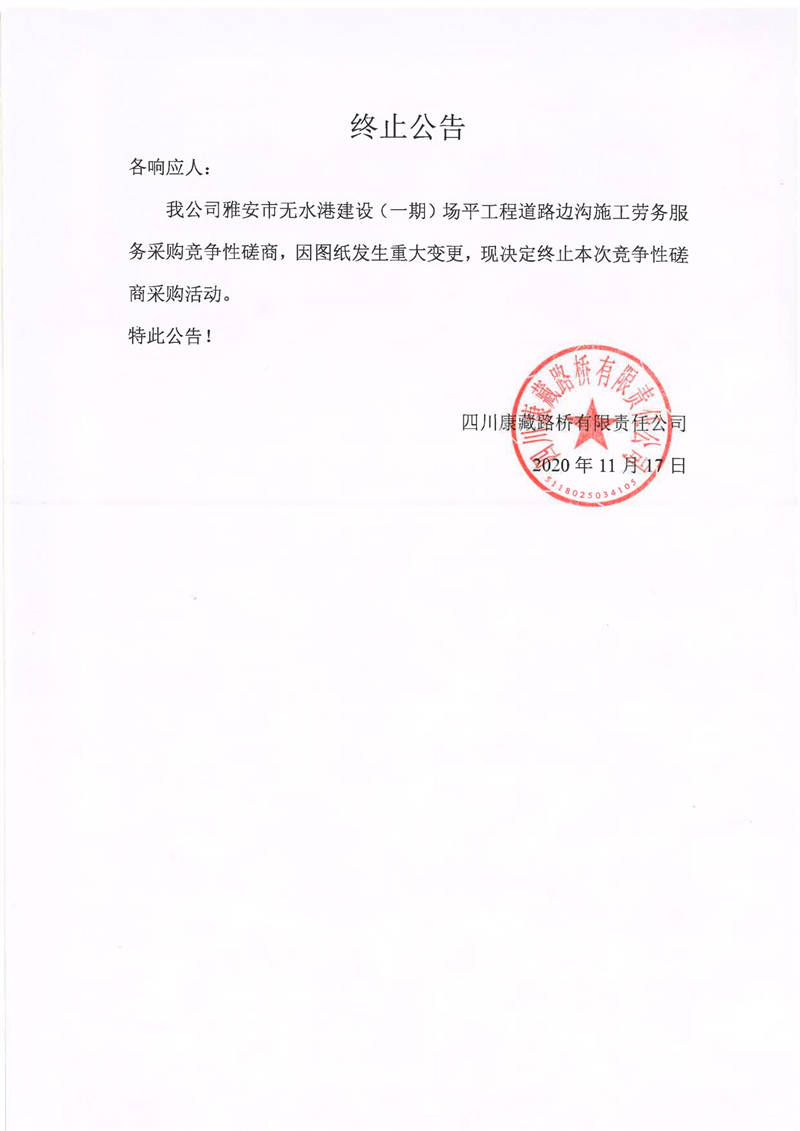 四川康藏路橋有限責任公司雅安市無水港建設(一期)場平工程道路邊溝施工勞務服務采購終止公告