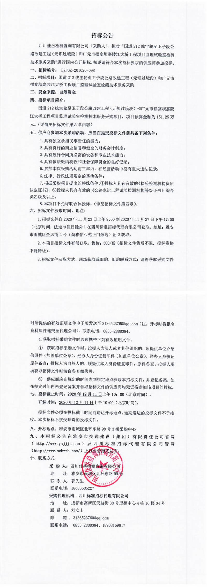 四川佳岳檢測(cè)咨詢有限公司國(guó)道212線寶輪至衛(wèi)子段公路改建工程(元壩過(guò)境段)和廣元市擺宴壩嘉陵江大橋工程項(xiàng)目監(jiān)理試驗(yàn)室檢測(cè)技術(shù)服務(wù)采購(gòu)招標(biāo)公告