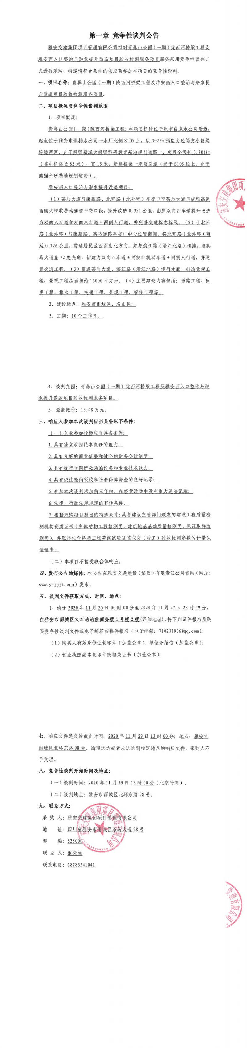 雅安交建集團(tuán)項目管理有限公司青鼻山公園(一期)隴西河橋梁工程及雅安西入口整治與形象提升改造項目驗(yàn)收檢測服務(wù)項目競爭性談判公告
