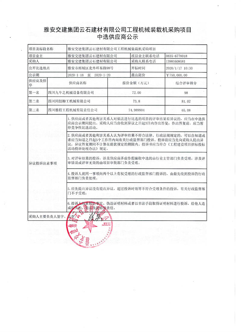 雅安交建集團云石建材有限公司工程機械裝載機采購項目中選供應商公示