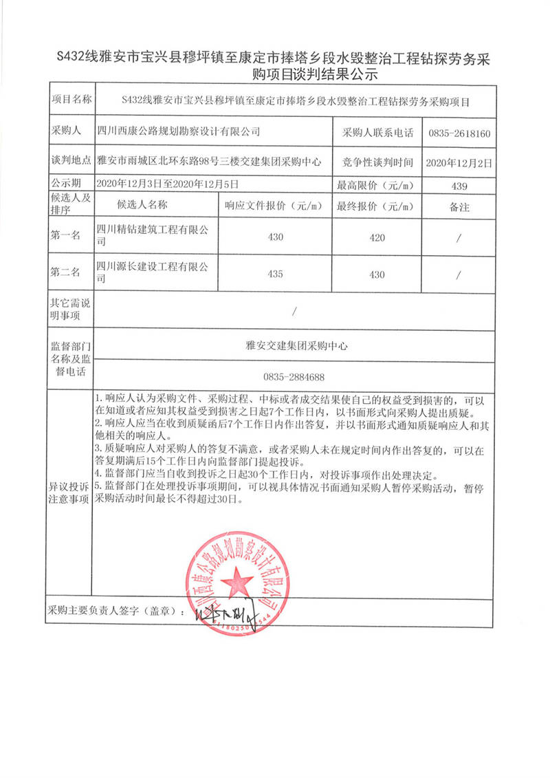 四川西康公路規(guī)劃勘察設(shè)計(jì)有限公司S432線雅安市寶興縣穆坪鎮(zhèn)至康定市捧塔鄉(xiāng)段水毀整治工程鉆探勞務(wù)采購(gòu)項(xiàng)目談判結(jié)果公示