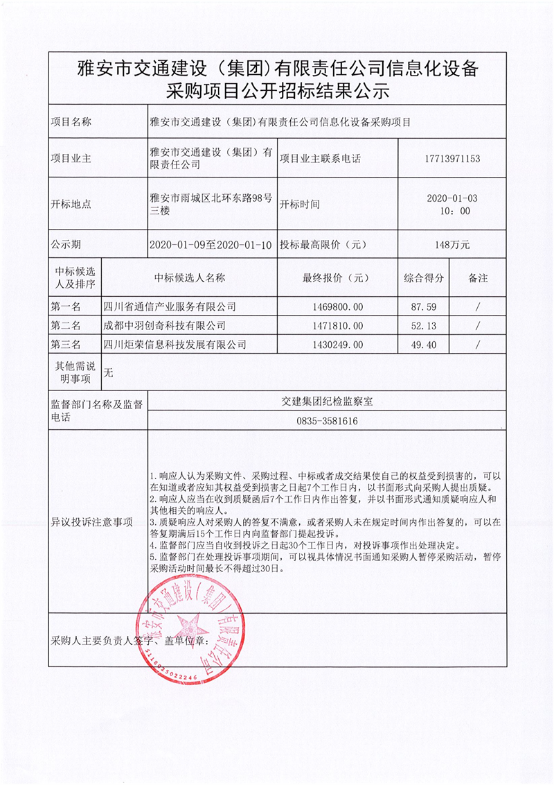雅安市交通建設(集團)有限責任公司信息化設備采購項目公開招標結果公示