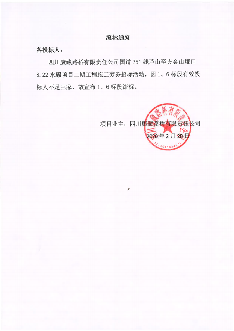 四川康藏路橋有限責(zé)任公司國道351線蘆山至夾金山埡口8.22水毀項(xiàng)目二期工程施工勞務(wù)(1標(biāo)段、6標(biāo)段)流標(biāo)通知