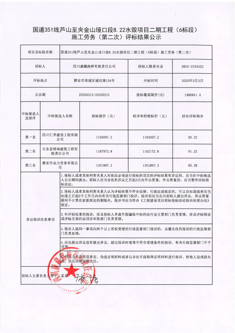 四川康藏路橋有限責(zé)任公司國道351線蘆山至夾金山埡口段8.22水毀項(xiàng)目二期工程(6標(biāo)段)施工勞務(wù)(第二次)評(píng)標(biāo)結(jié)果公示