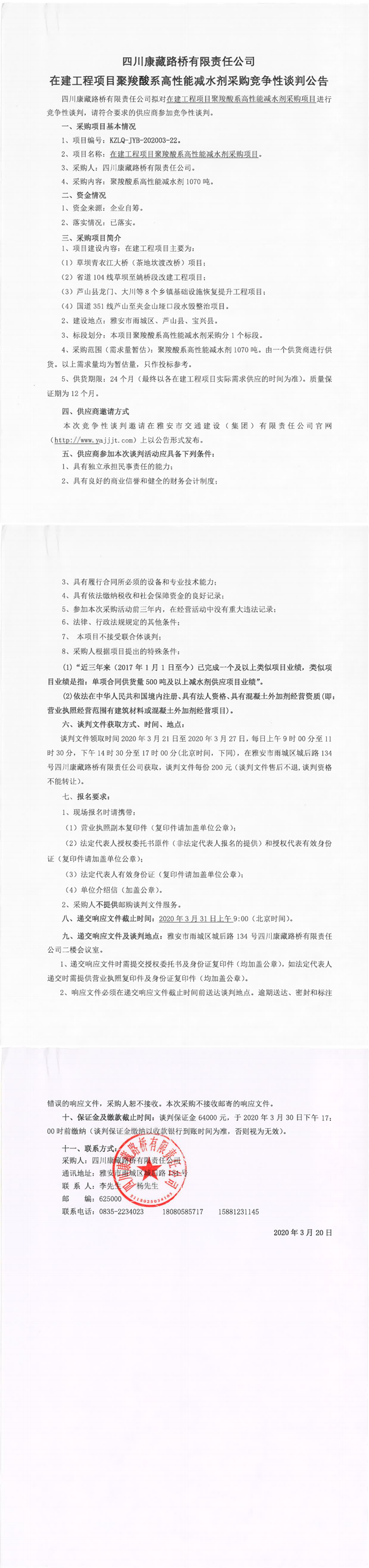四川康藏路橋有限責(zé)任公司在建工程項(xiàng)目聚羧酸系高性能減水劑采購競爭性談判公告