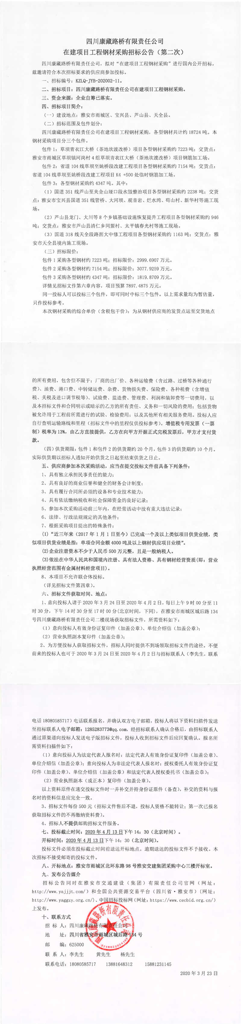 四川康藏路橋有限責(zé)任公司在建項(xiàng)目工程鋼材采購招標(biāo)公告(第二次)