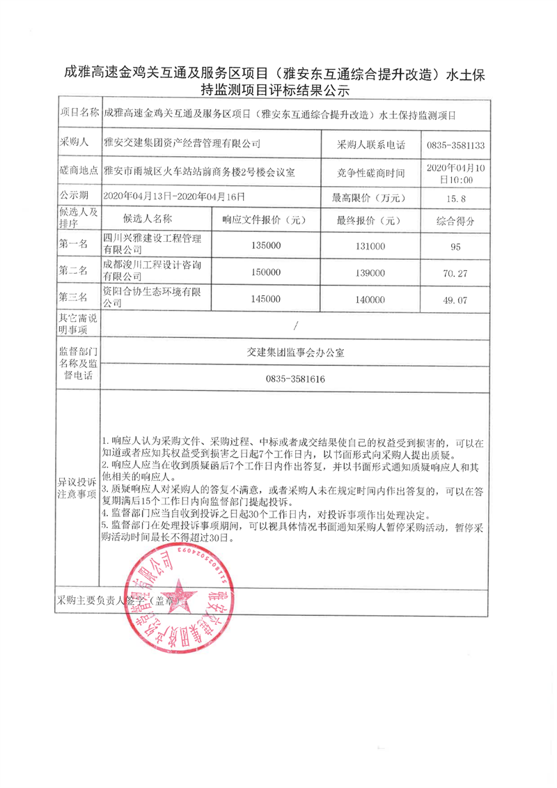 雅安交建集團資產(chǎn)經(jīng)營管理有限公司成雅高速金雞關(guān)互通及服務(wù)區(qū)項目(雅安東互通綜合提升改造)水土保持監(jiān)測項目評標(biāo)結(jié)果公示