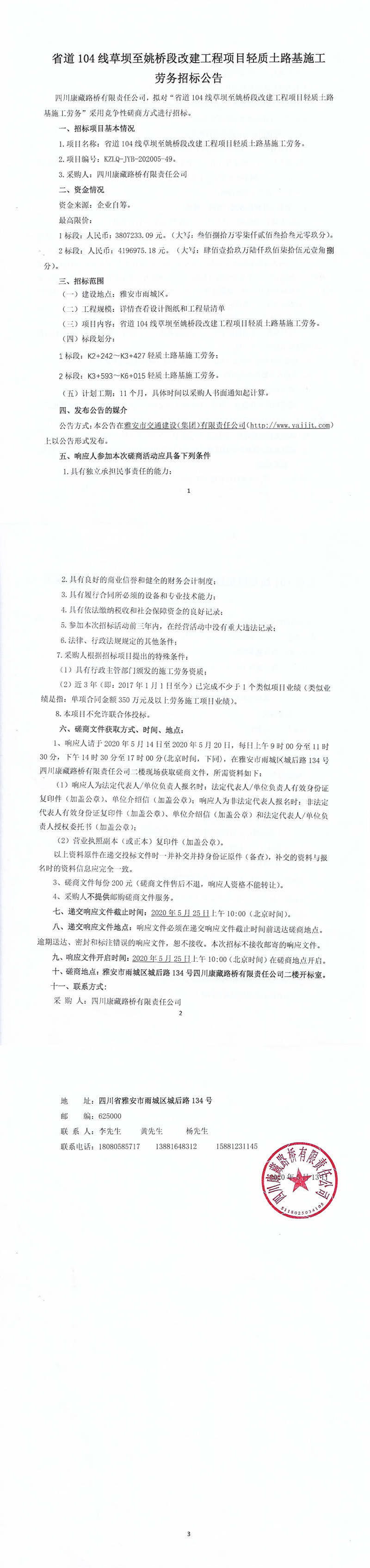 四川康藏路橋有限責任公司省道104線草壩至姚橋段改建項目輕質土路基施工勞務招標公告