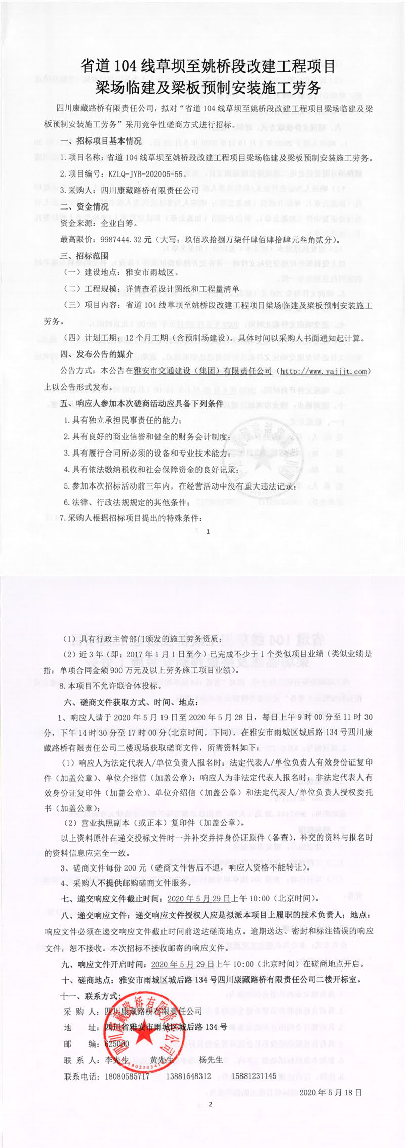 四川康藏路橋有限責(zé)任公司省道104線草壩至姚橋段改建工程項目梁場臨建及梁板預(yù)制安裝施工勞務(wù)競爭性磋商公告