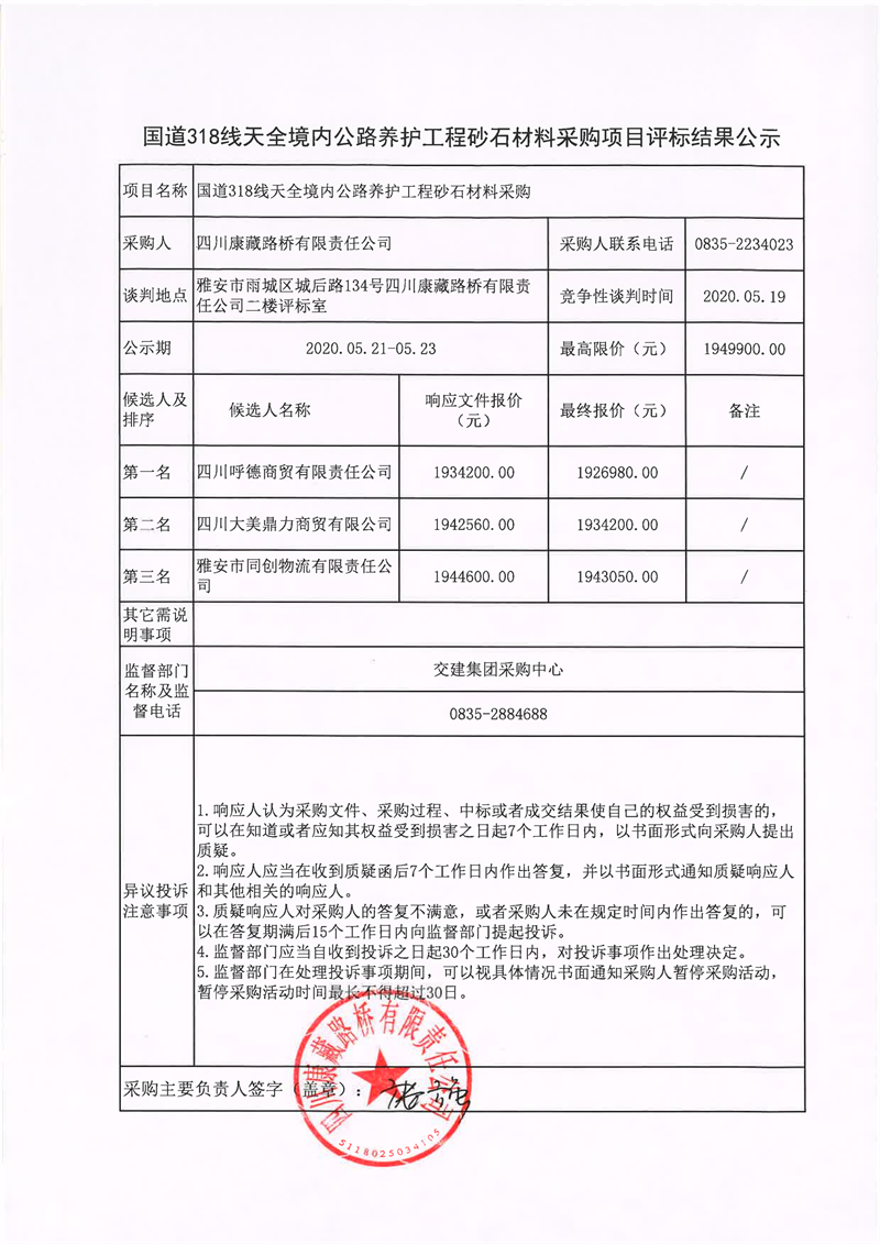 四川康藏路橋有限責(zé)任公司國道318線天全境內(nèi)公路養(yǎng)護(hù)工程砂石材料采購項(xiàng)目評標(biāo)結(jié)果公示