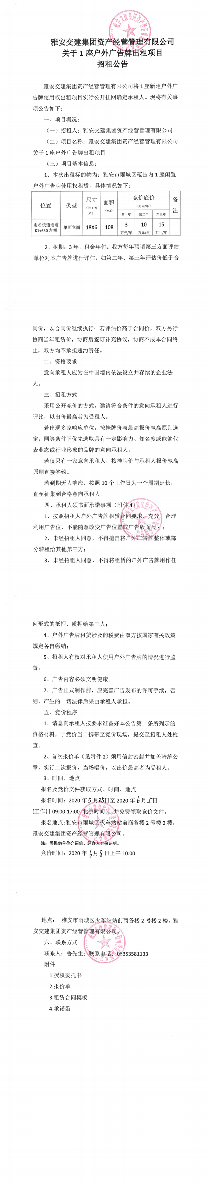 雅安交建集團資產(chǎn)經(jīng)營管理有限公司關于1座戶外廣告牌出租項目招租公告