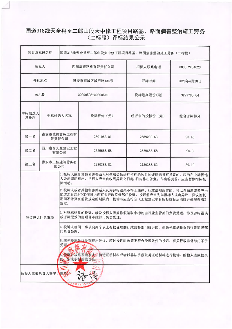 四川康藏路橋有限責任公司國道318線天全縣至二郎山段大中修工程項目路基、路面病害整治施工勞務(一標段)評標結果公示
