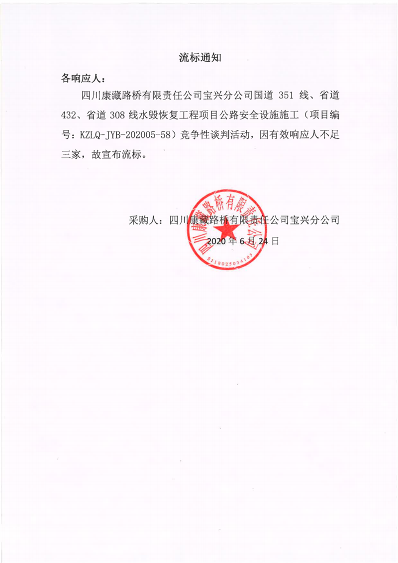 四川康藏路橋有限責(zé)任公司寶興分公司國(guó)道351線(xiàn)、省道432線(xiàn)、省道308線(xiàn)水毀修復(fù)工程項(xiàng)目公路安全設(shè)施施工流標(biāo)通知