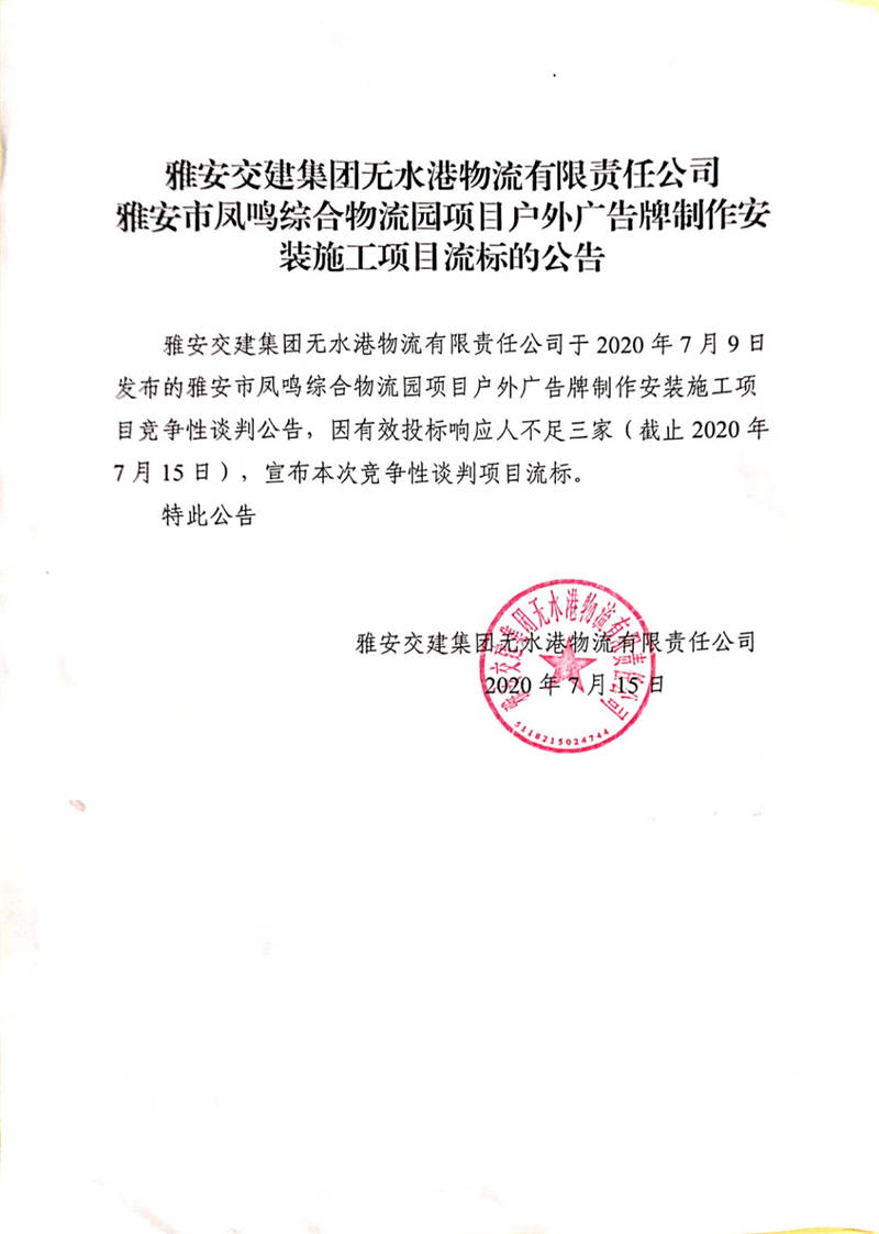 雅安交建集團(tuán)無(wú)水港物流有限責(zé)任公司雅安市鳳鳴綜合物流園項(xiàng)目戶(hù)外廣告牌制作安裝施工項(xiàng)目流標(biāo)公告