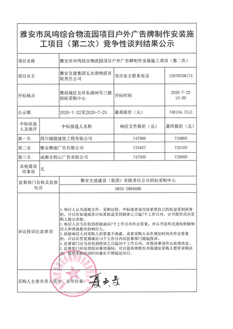 雅安交建集團(tuán)無(wú)水港物流有限責(zé)任公司雅安市鳳鳴綜合物流園項(xiàng)目戶外廣告牌制作安裝施工項(xiàng)目(第二次)競(jìng)爭(zhēng)性談判結(jié)果公示