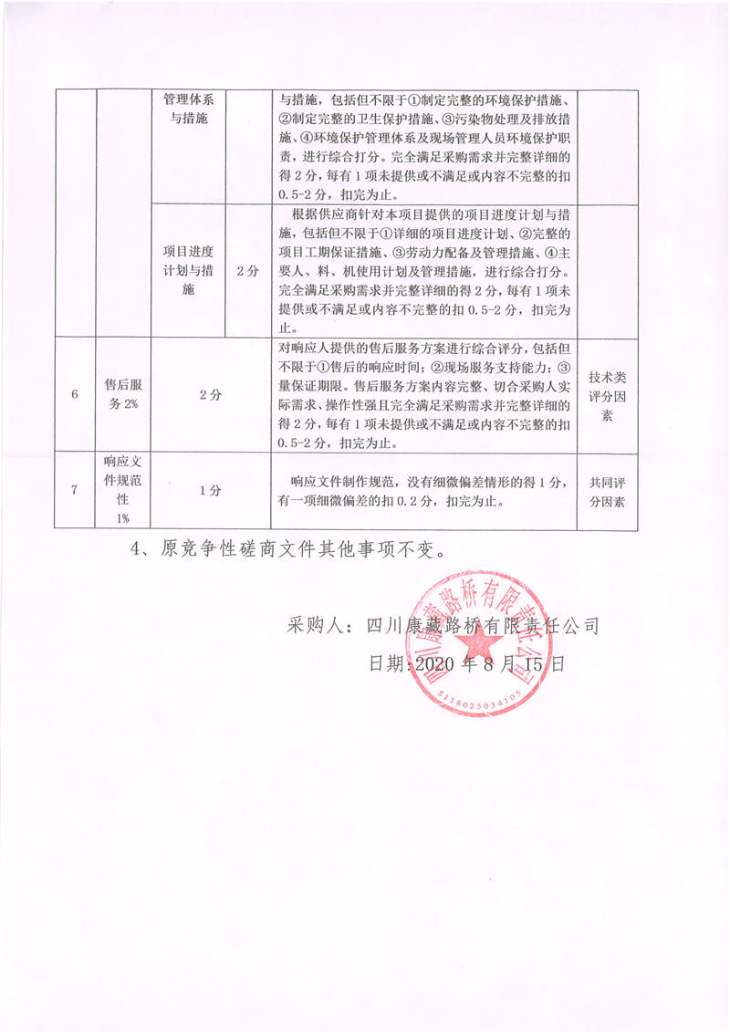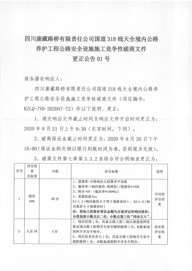 四川康藏路橋有限責(zé)任公司國道318線天全境內(nèi)公路養(yǎng)護(hù)工程公路安全設(shè)施施工競爭性磋商文件更正公告01號
