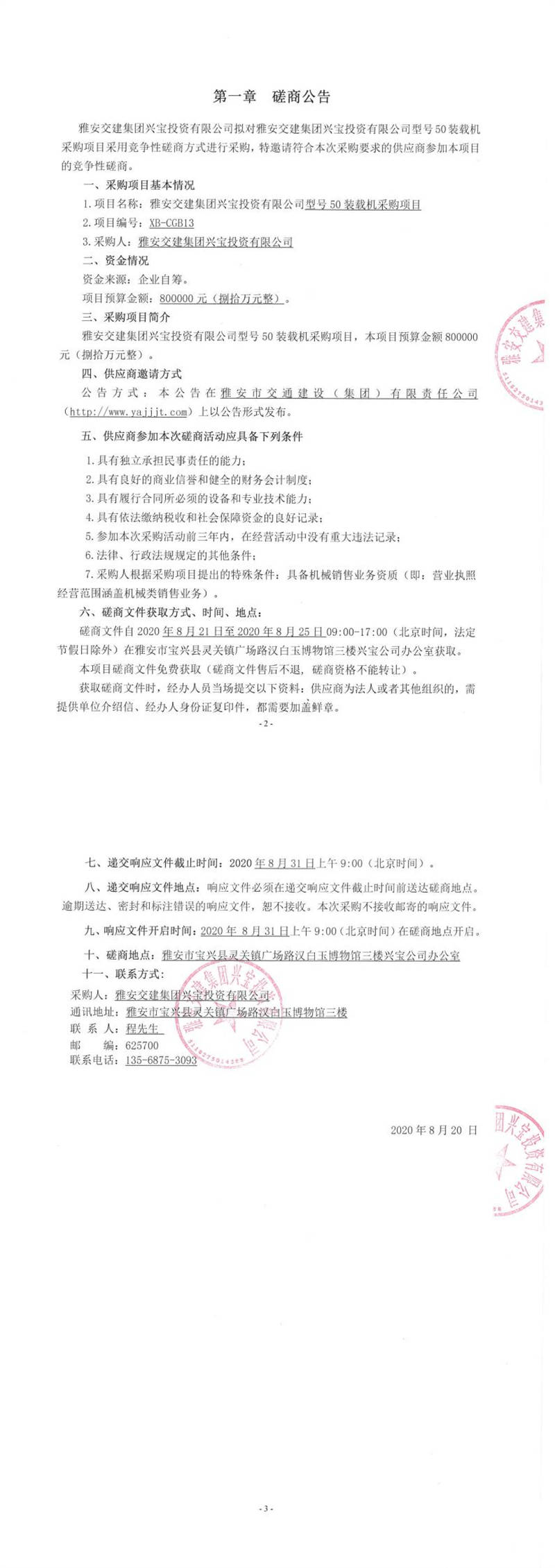 雅安交建集團(tuán)興寶投資有限公司型號(hào)50裝載機(jī)采購項(xiàng)目磋商公告