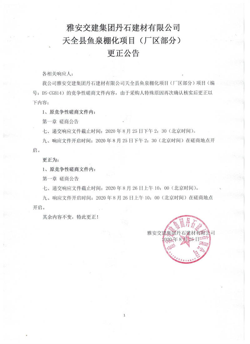 雅安交建集團丹石建材有限公司天全縣魚泉棚化項目(廠區(qū)部分)更正公告