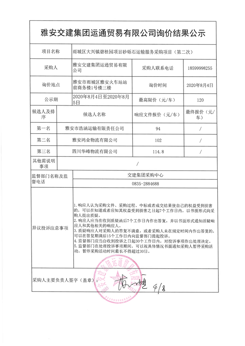 雅安交建集團運通貿(mào)易有限公司雨城區(qū)大興鎮(zhèn)碧桂園項目砂礫石運輸服務(wù)采購項目(第二次)詢價結(jié)果公示