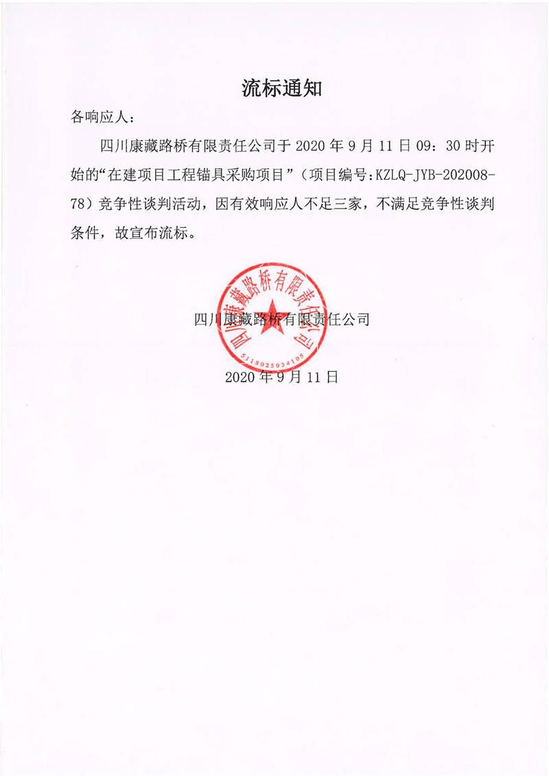 四川康藏路橋有限責(zé)任公司在建項目工程錨具采購競爭性談判流標(biāo)通知