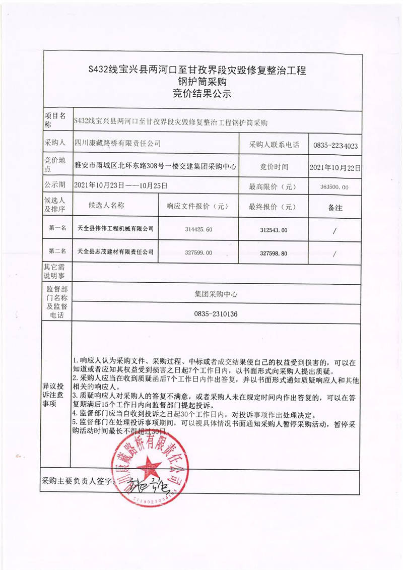四川康藏路橋有限責(zé)任公司S432線寶興縣兩河口至甘孜界段災(zāi)毀修復(fù)整治工程鋼護筒采購競價結(jié)果公示