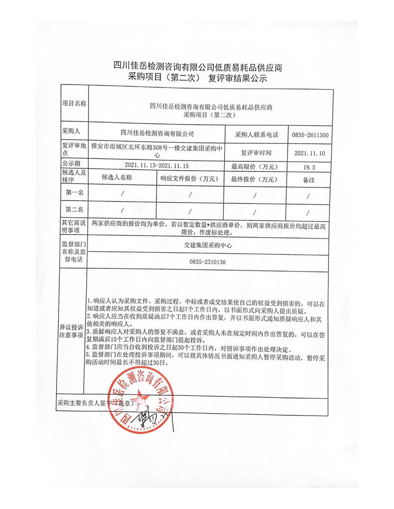 四川佳岳檢測咨詢有限公司低質(zhì)易耗品供應(yīng)商采購項目(第二次)復(fù)評審結(jié)果公示