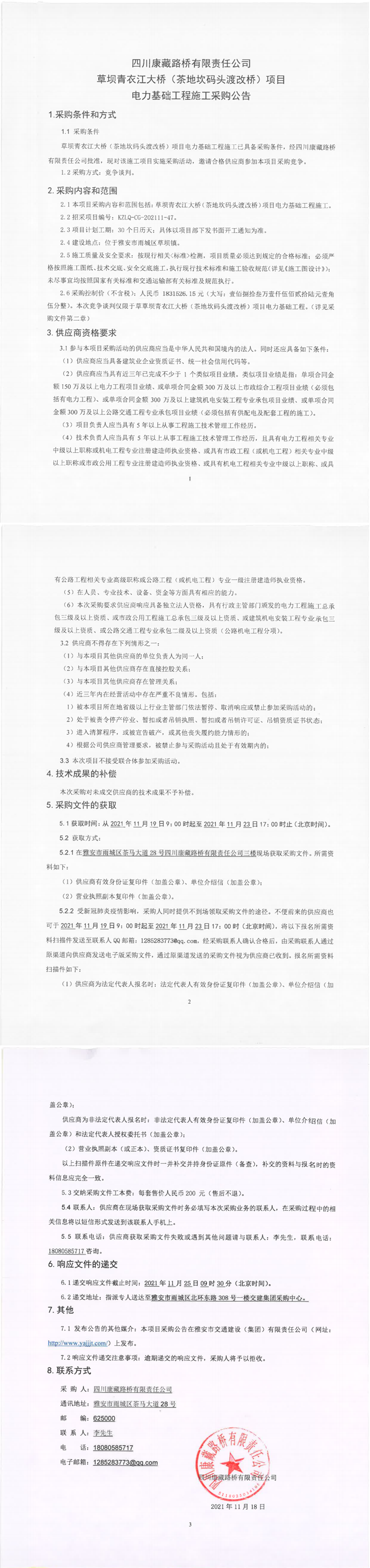 四川康藏路橋有限責(zé)任公司草壩青衣江大橋(茶地坎碼頭渡改橋)項(xiàng)目電力基礎(chǔ)工程施工采購(gòu)公告