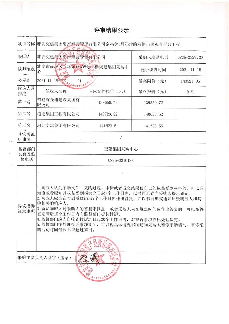 雅安交建集團(tuán)資產(chǎn)經(jīng)營管理有限公司金雞關(guān)1號還建路右側(cè)山頂觀景平臺工程評審結(jié)果公示